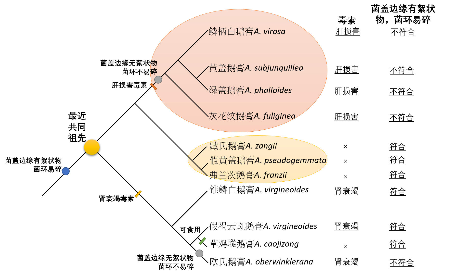 显然,“毒鹅膏类”和“无毒鹅膏类”都不是定义完备的类群,这些类群不能被系统学界所接受。那么什么样的类群,才是系统学所承认的呢?让我们来看看“肝损害类”。