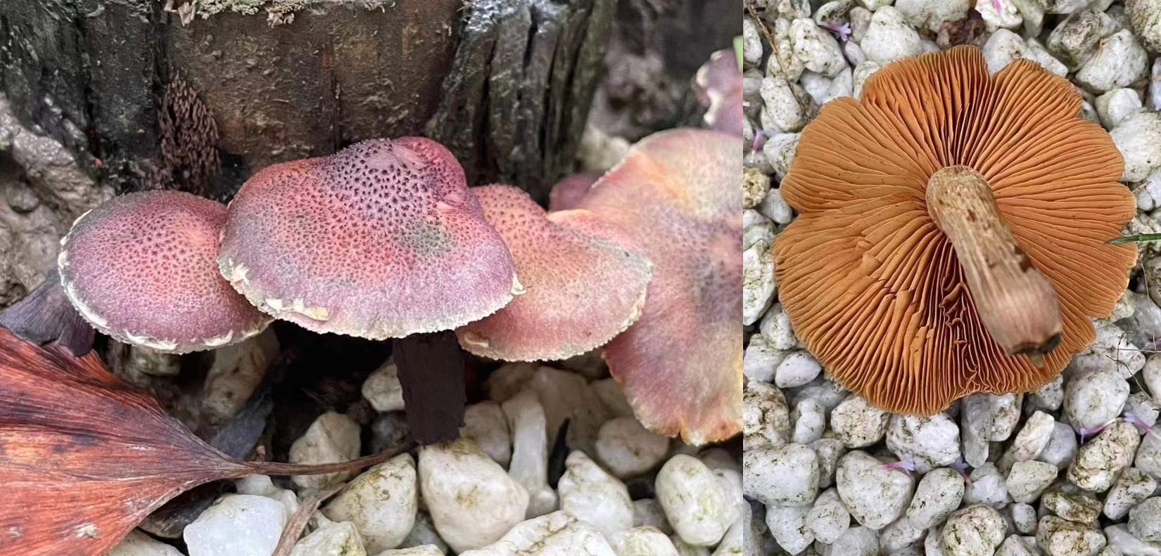 ✓ 多角度拍摄蘑菇,要能清晰看到蘑菇各部位的位置和形态,尤其是蘑菇的菌盖背面。大多数蘑菇菌盖背面的子实层体(菌褶、菌孔等)是重要而不可或缺的鉴定特征,但没有经验的人很少会拍摄蘑菇的背面。可以将蘑菇正面和背面分开拍摄,也可以选择一个能同时看到正面和背面的角度。当有多个蘑菇,可以摘一朵倒置放在其他蘑菇边上拍照。