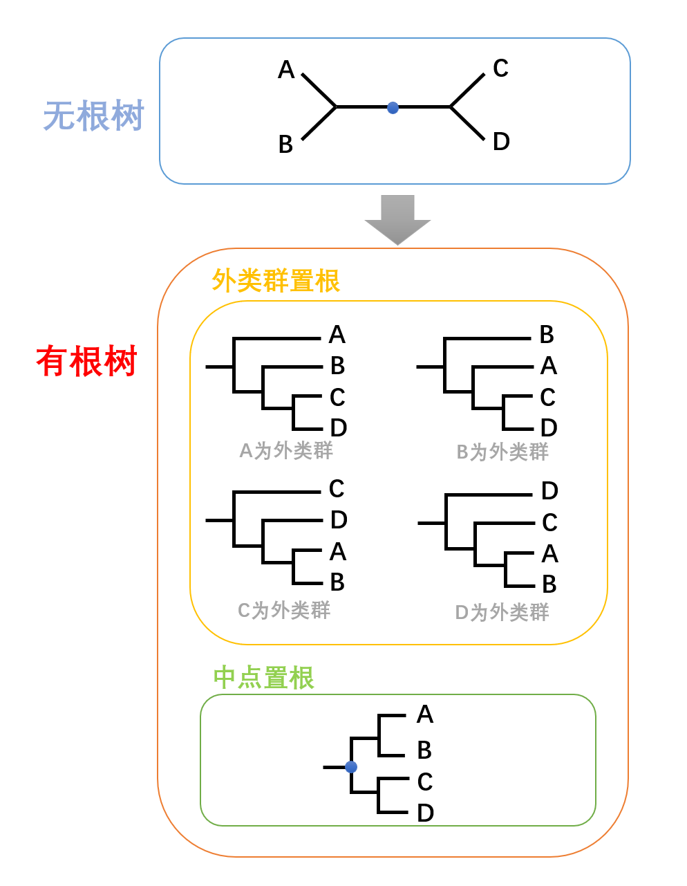 系统发育树可以分为无根树和有根树。无根树仅表示物种之间分化关系的远近,并不知道谁更早分化;有根树则是在无根树“置根”之后得到的,可以显示物种分化的先后顺序。置根通常采用外类群法——在树中引入一个外类群,其亲缘关系足够远,必定是树中最早分化出来的,基于该外类群推测其他所有剩余类群的分化关系,也可以采用中点法——取分化最远的两个枝条的中点为根。