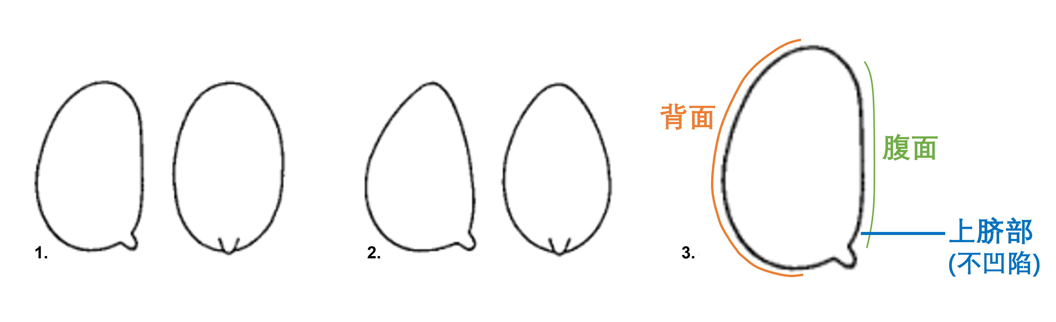 杏仁形孢子的示意图。图1侧面观杏仁形(左),背腹观椭圆形(右);图2侧面观杏仁形且顶部稍尖(左),背腹观卵形(右);图3是关于背面、腹面和上脐部的示意。原图来自于Vellinga 1988,有改动。