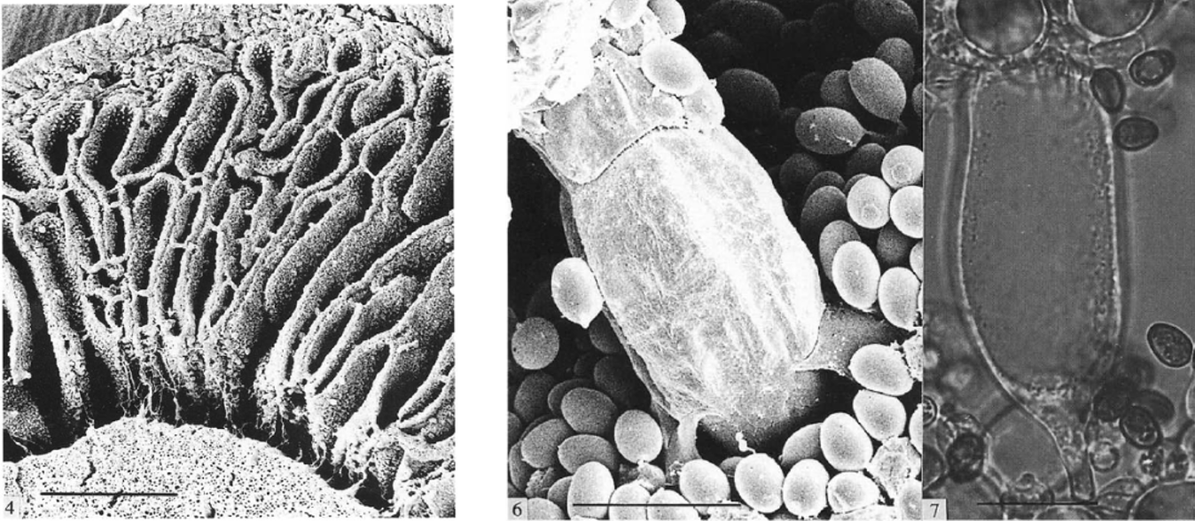 在一些蘑菇中,菌褶之间排列比较紧密,一片菌褶的子实层上的褶缘囊状体可能会体型过大,顶到对面菌褶的子实层上。当这种情况发生时,对面被顶到的原担子可能会停止发育为担子,而重新发育成一种特殊的黏着性细胞,以固定囊状体的位置,即cystesium。这种细胞的细胞质中有颗粒和空腔,和周围细胞差异大。 ![]() 左1图为灰盖拟鬼伞近菌盖顶部的菌褶横切图,可见发育中的错综复杂的菌褶片,和褶片之间的囊状体-cystesium对搭建的横向“桥梁”。右2图是囊状体-cystesium对在SEM和光学显微镜下的图片。来源:Siu Chiu & David Moore et al. 1990 |