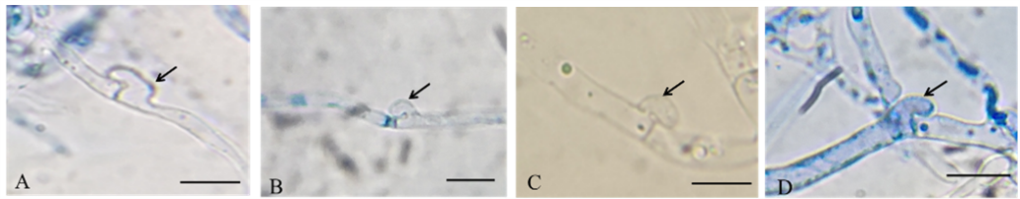 在形成锁状联合时,若子代凸起没有和母体细胞融合,则形成假锁状联合,它可以看作是菌丝在隔膜处形成的短分支,甚至有时这样的短分支可以发育成另一根菌丝。 参考文献: Homeodomain 1 Genes of the Different HD Subloci of Flammulina velutipes Can Activate the HD Pathway and Are Involved in Mating, Clamp Cell Formation, and Upregulation of FvClp1, 2024. Fang Liu, Tiansheng Chou, Wei Wang, and Baogui Xie. Journal of Agricultural and Food Chemistry 72(17): 9915–9922 https://doi.org/10.1021/acs.jafc.3c07853 |