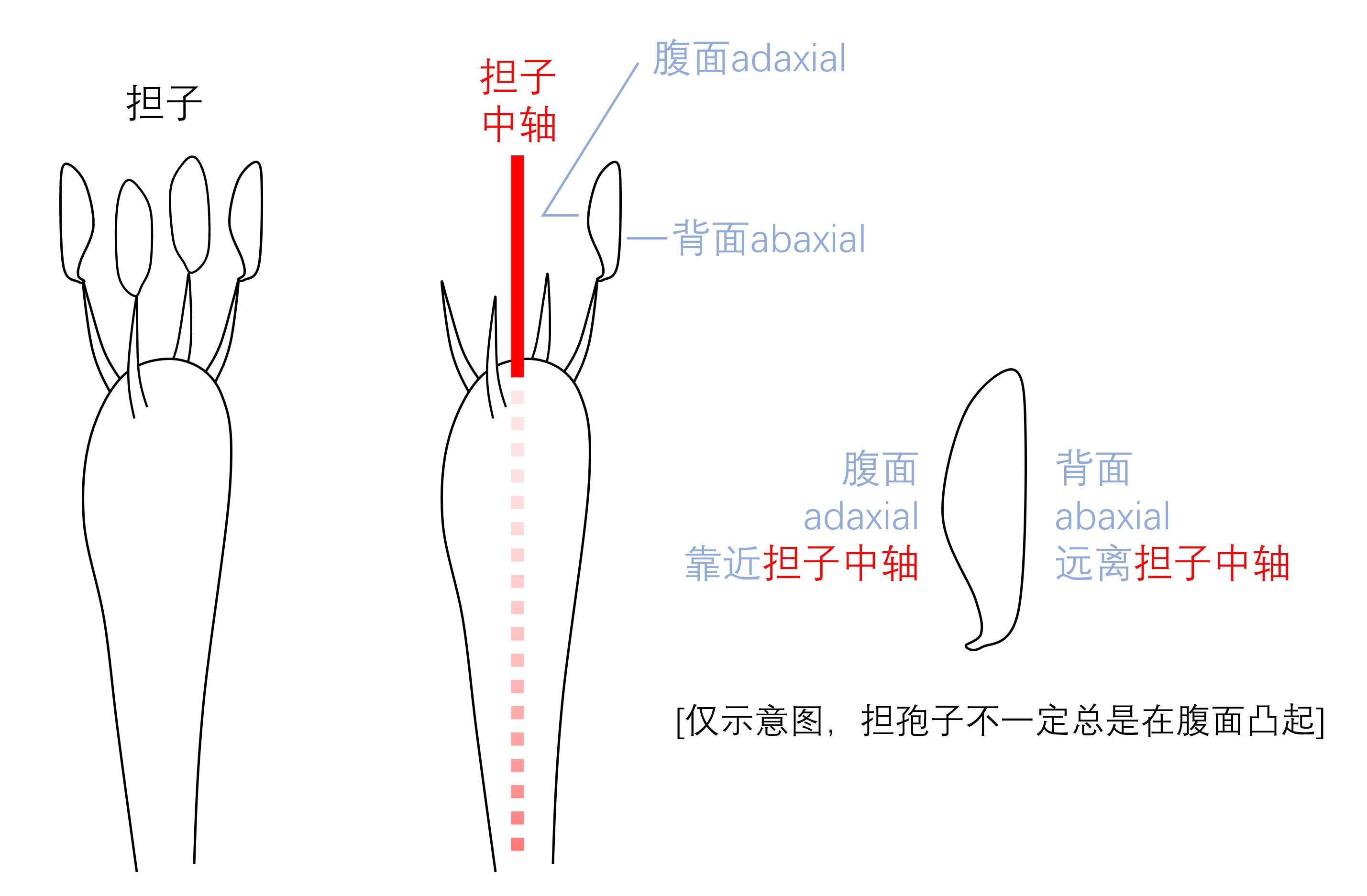 担孢子的腹侧和背侧取决于担子中轴和孢子的位置关系。