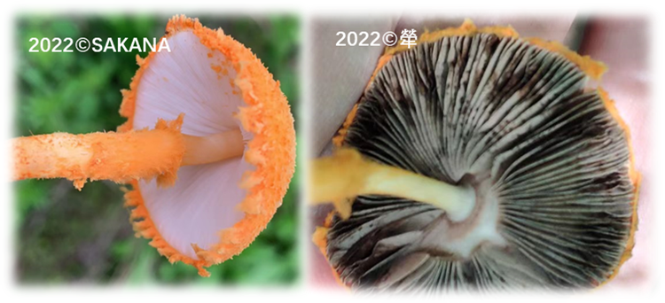 图五 三硫色蘑菇A.trisulphuratus的菌褶颜色变化,从开始的淡粉色转变为最后的棕灰色。蘑菇属物种的菌褶普遍会经历这样的变化。拍摄者见水印。