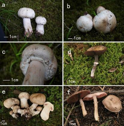 5)菌肉受伤的变色情况。一些物种受伤变红,另一些则受伤变黄。菌柄基部的菌肉受伤变色情况一般较为明显。