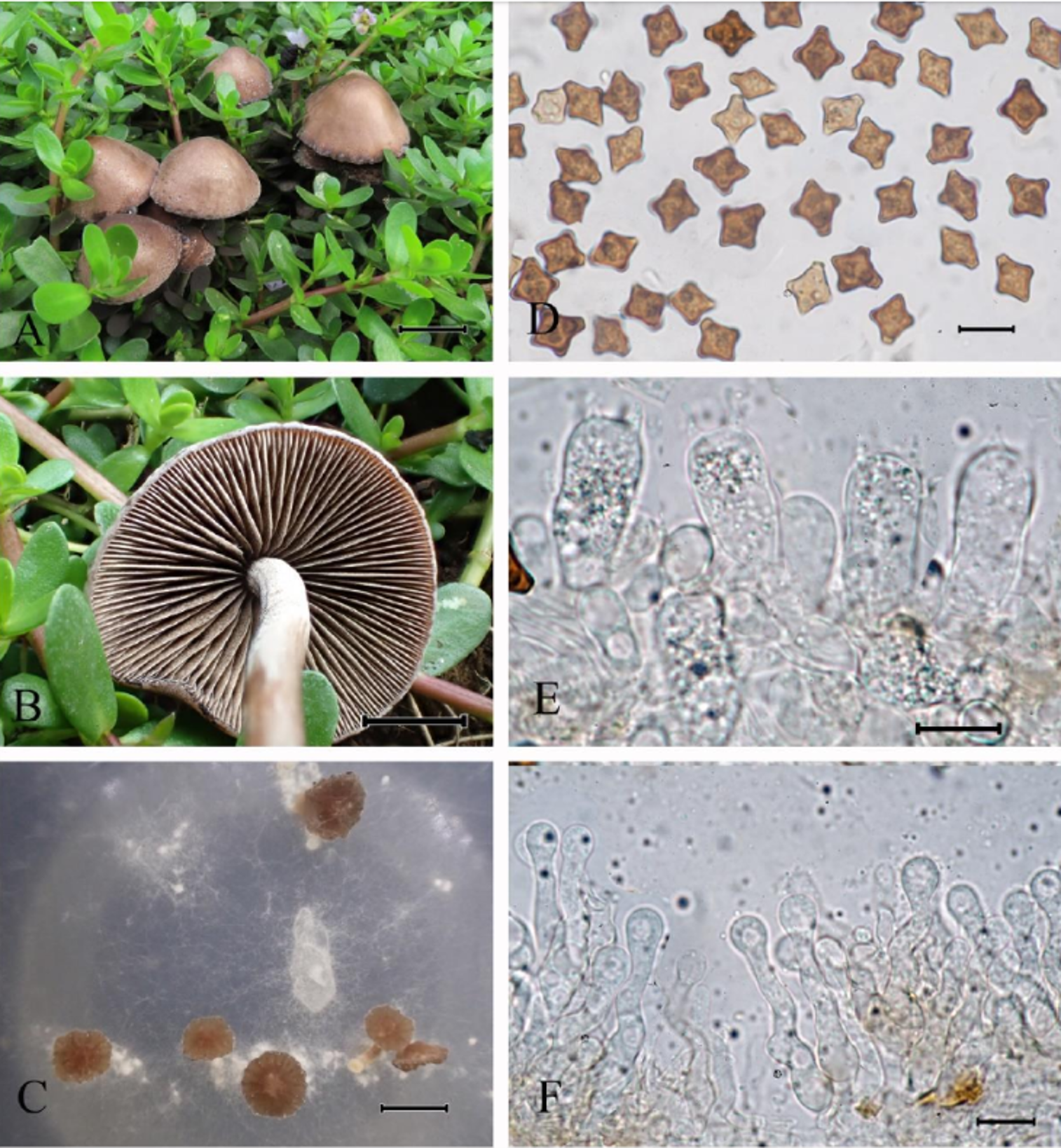 该物种的主要特征是菌盖和菌柄褐色调;菌褶斑驳状,以褐色为主;担孢子十字形。此物种的定义存在争议,且相关系统学研究较少。该物种在我国台湾省有报道。命名历史该种最早在1973年被Hongo发表,当时置于疣孢斑褶菇属Panaeolin...... | ![]() |