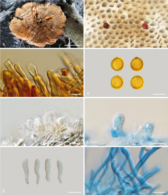 Basidiocarp stipitate, pleuro- or mesopodal. Stipe short, thin to thick, more or less round in section or slightly ellipsoid, 31-40 mm long × 3.5-22 mm wide at the occasionally slightly bulbous base, down to 5-14 mm at the apex, smooth, glabrous, covered by a hard, horny crust, brown to dark brown (mainly chocolate brown, 6E6 but up to 6F6). Pileus laterally, centrally or eccentrically attached to the stipe, spathulate, flabelliform, semicircular to dimidiate, up to 20-60 mm long, 30-90 mm wide, or circular, slightly ellipsoid, to irregular in shape, and up to (28)36-135 mm diam., applanate, horizontal, to somewhat campanulate in section, occasionally slightly umbonate at the centre, 9-15 mm thick at the base/centre, down to 1-2 mm thick at the margin. Pileus surface slightly to distinctly concentrically sulcate and radially wrinkled, dull, glabrous, covered by a crust, homogeneously brown all over the surface (chocolate brown (6E5-6), cocoa brown), greyish chocolate brown, up to dark brown (toward 6F6), or commonly with narrow to medium size, concentric, darker bands, dark brown up to blackish brown (6F5-6)) to blackish, larger and darker near the base or at the centre, rarely with a tint of reddish (7F6), occasionally paler, pale corky (4B3, 5B4, greyish orange) near the margin. Margin sharp to abruptly bent, creamy, pale corky, or concolorous with the pileus, chocolate brown. Pore surface in variable orange tint when fresh, from very pale orange, almost white, to bright orange, cadmium orange (5A8, to more commonly deep orange, carrot red, orange peel (6AB7-8), drying paler, whitish, pale orange white (6A3), greyish orange (5B4-5), or darker, near brick red or dirty brownish orange (6BC5-6, 6D5-7). Pores round, even, small, (6)7-8/mm, (85)95-147(170) µm diam. (› = 114 µm diam.). Dissepiments thick, smooth or with a slightly pruinose aspect. Trama of the stipe usually homogeneous, with a corky consistency, a fibrous texture when fresh, or heterogeneous, with the centre slightly hollowed or having a looser consistency, which is more obvious near the base, then shrinking on drying, white, whitish, and drying whitish, pale creamy, faintly pale greyish brown near the surface (the crust). Trama of the pileus 3-14 mm thick at the centre or base down to 1-3 mm thick at the margin, homogeneous, with a hard corky consistency, a fibrous texture, white, whitish, and drying whitish, pale creamy, faintly pale greyish brown near the crust. Tube layer single, 2-9 mm thick, white to pale orange when fresh, drying off-white, pale creamy, greyish orange (5B4, 6B4), light brown (6CD6-7), reddish golden, light brown), with a harder consistency, up to hard resinaceous, and a denser fibrous texture. Crust on the stipe and pileus, hard, horny, dark brown to blackish brown, 50-200 µm thick. Hyphal system di-trimitic in the context and the trama of the tubes. Generative hyphae thin-walled, clamped. Vegetative hyphae in all part of the basidiome hyaline, strongly dextrinoid, cyanophilous. Stipe and Context of a similar composition. Trama of the tubes dimitic with generative and hyaline arboriform skeletal hyphae. Mature basidia not seen. Basidiospores subglobose to globose, double-walled, the endospore thick-walled, faintly yellowish, slightly dextrinoid, cyanophilous, with conspicuous fine, cylindrical endosporic projections, the exospore hyaline, thin, negative in Melzer’s reagent not cyanophilous, the endo-exosporic space 0.5-0.8 µm thick, (6.8)7.5-9.8(10.3) × (6.5)7.0-9.0(9.5) µm, R = (1.0)1.1-1.2(1.2) (› = 8.6 × 7.8 µm, › = 1.1). Chlamydospores absent. Substrate. On soil, or wood (buried wood?). Type of rot. A white rot (positive reaction with ABTS in pure culture). Sexuality. Unknown.