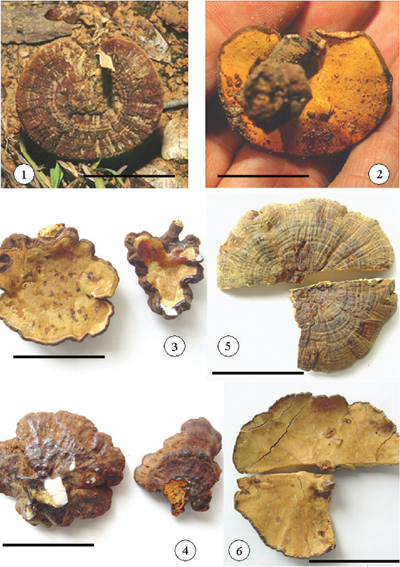 Foraminispora rugosa的菌盖表面和菌孔面。标尺:1-2: 20mm,3-4: 40mm,5-6: 70mm。来源:Taxonomy and phylogeny of polypores with ganodermatoid basidiospores (Ganodermataceae)