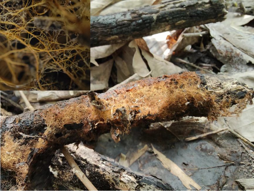 ![]() 辐射状向外伸展的菌丝体,蘑菇便是从这样的菌丝体上长出来的。©盐粒 ![]() 黄鳞小鬼伞橙色的菌丝束。 菌丝hyphae |