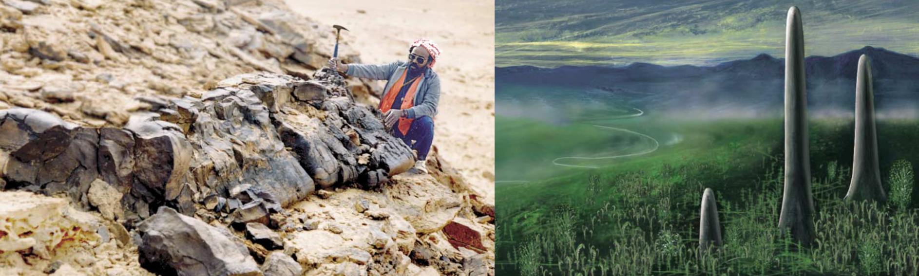 一类生活在泥盆纪、志留纪的巨型陆生疑似真菌生物:原杉藻Prototaxites;化石和假想复原图(Mary Parrish绘)。来源:Rotted wood–alga–fungus: the history and life of Prototaxites Dawson 1859