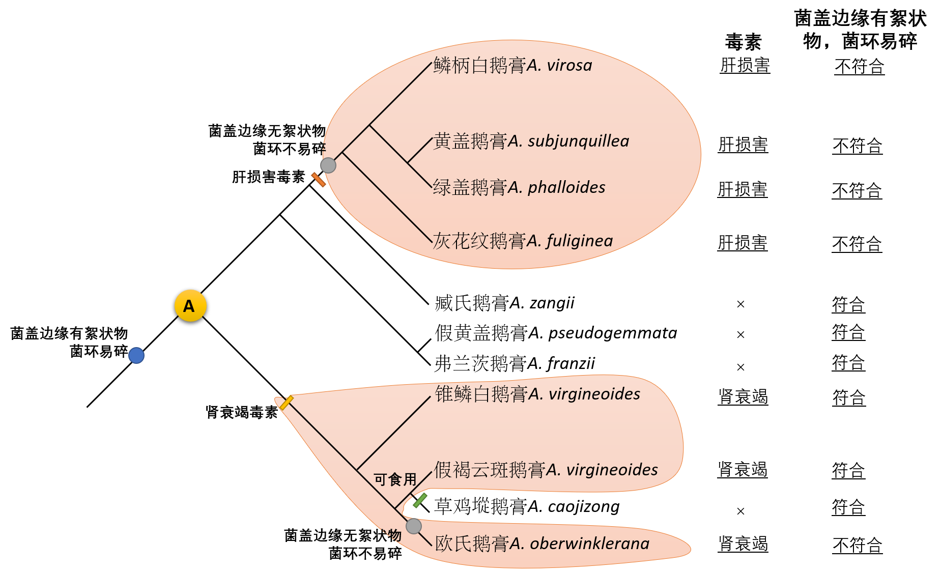 现在,我们将之前所分出的“毒鹅膏类”这个类群标记在系统树上: