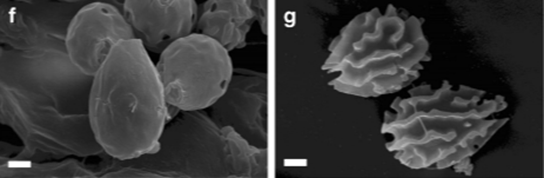 b: Cristataspora coffeata的担子果; c: Cristataspora flavipora的菌盖表面。标尺:1cm。引自Taxonomy and phylogeny of polypores with ganodermatoid basidiospores (Ganodermataceae)咖啡脊孢芝Cristataspora coffeata (Berk.) Robledo, Costa-Rezende & de Madrignac Bonzi 2020 异名: Amauroderma coffeatum (Berk.) Murrill 1905 Fomes augustus (Berk.) Cooke 1885 Fomes coffeatus (Berk.) Sacc. 1888 Fomes hemibaphus (Berk.) Cooke 1885 Ganoderma coffeatum (Berk.) J.S. Furtado 1967 Humphreya coffeata (Berk.) Steyaert 1972 Polyporus augustus Berk. 1856 Polyporus coffeatus Berk. 1839 Polyporus hemibaphus Berk. 1856 Scindalma coffeatum (Berk.) Kuntze 1898 Scindalma hemibaphum (Berk.) Kuntze 1898 子实体一年生,具中生柄,单生。菌盖圆形,略呈漏斗状,革质至木栓质;菌盖表面灰褐色,不具漆状光泽,具同心环状沟纹和皱起以及延伸至菌盖边缘的辐射状线条和不明显皱起;边缘锐,波状。菌孔面白色至奶油色;菌孔圆形;菌管灰褐色至浅褐色;菌肉奶油色,同质或具明显或不明显的黑色线;菌柄纤维质至木栓质,光滑,灰褐色,与菌盖菌肉同色,实心。 Cristataspora coffeata的担孢子电镜图(近光滑的外孢壁和具纵向排列的脊状突起纹饰的内孢壁)引自Taxonomy and phylogeny of polypores with ganodermatoid basidiospores (Ganodermataceae)分布:分布于阿根廷、古巴等新热带地区,中国没有分布 生态:生于地面,可能与地下腐木相连 讨论:该种原隶属于汉弗莱芝属,因其内孢壁具横向或纵向的脊状纹饰的形态学特征以及系统发育学分析高度支持其与C. flavipora成一单系群,故被转移至脊孢芝属中。新组合描述本种分布于新热带地区,我国过往文献记载本种在中国亦有分布,但与原始描述有出入,该种在我国可能没有分布。 相似物种:与C. flavipora较为相似,但其内孢壁脊状纹饰通常为横向分布,而本种内孢壁脊状纹饰通常为纵向排列。 新组合描述: